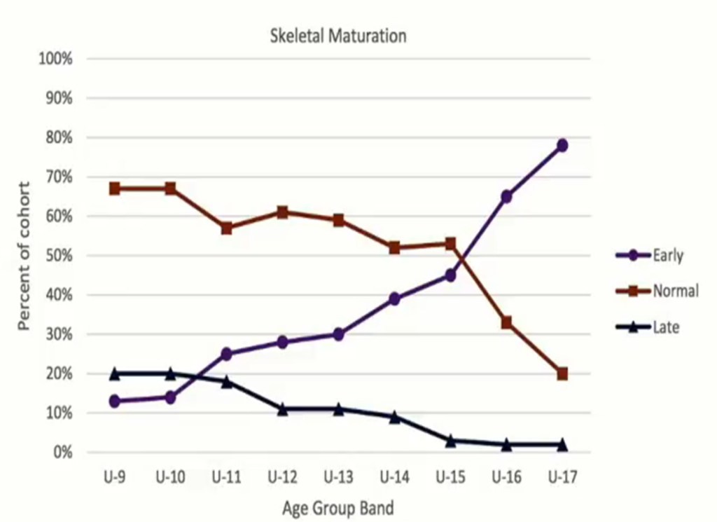 Players advanced in biological maturity generally perform better than those that are less advanced (Beunen et al., 1988; Malina et al., 2004), which can lead to a systematic exclusion of later maturing boys within team sports (Ostojic et al., 2014; Philippaerts, et al., 2006). The advanced physical (Gaston & Bennet, 2014; Gil et al., 2013; Delorme & Raspaud, 2009; Malina, Bouchard, & Bar-Or, 2004), cognitive (Jimenez & Pain, 2008; Bisanz, Morrison, & Dunn, 1995) and social (Dhuey & Lipscomb, 2008; Thompson et al., 2004) development of these older players can lead to increased propensity for this relatively older population to be chosen for representative squads and teams. Using these factors as markers for potential future performance can result in a biased view of potential and can facilitate recruitment into advanced teams or structures for earlier maturing individuals (Delorme, et al., 2010). A focus on short term success over longer term development can lead to a selection bias towards those players born earlier in the year, thus creating unfair advantages within a development system, as these advantages are perpetuated throughout the key developmental stages of a youth athlete (i.e. through access to better coaching facilities, higher competition and exposure to scouts). You can read more about it here.