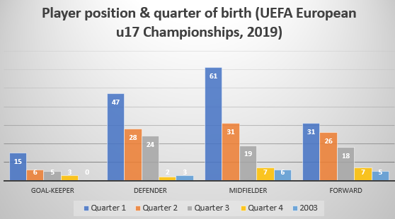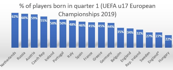 As can be seen below, the range of early born players within each squad varies. The Netherlands (who are the reigning champions at u17 level) display one of the largest recorded percentages of quarter 1 births seen in youth football research, with 62% of their players being born in the first 3 months of the year.