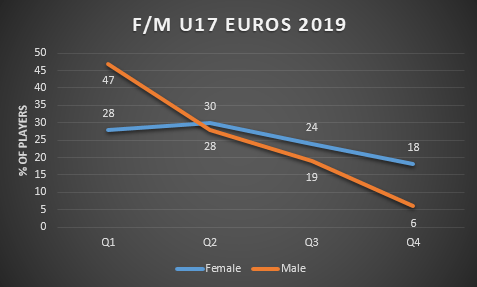 In 2019, I conducted an analysis of the dates of births of the male footballers that were listed on the official programme for the 16 teams that qualified for the UEFA U17 championship. A significant RAE was evident within that sample (read more here https://talentdevelopmentinirishfootball.com/2019/05/09/relative-age-effect-in-uefa-u17-championships-2019/ ). I conducted a similar analysis of the female U17 UEFA 2019 tournament. The final stages consisted of 8 teams (Bulgaria (hosts), England, Netherlands, Spain, Germany, Portugal, Denmark and Austria). 117 players were born in 2002, with 35 born in 2003 and 8 born in 2004. A comparison of male and female U17 RAE figures are below, broken down into quarters (I.e. Jan/Feb/March is Q1).